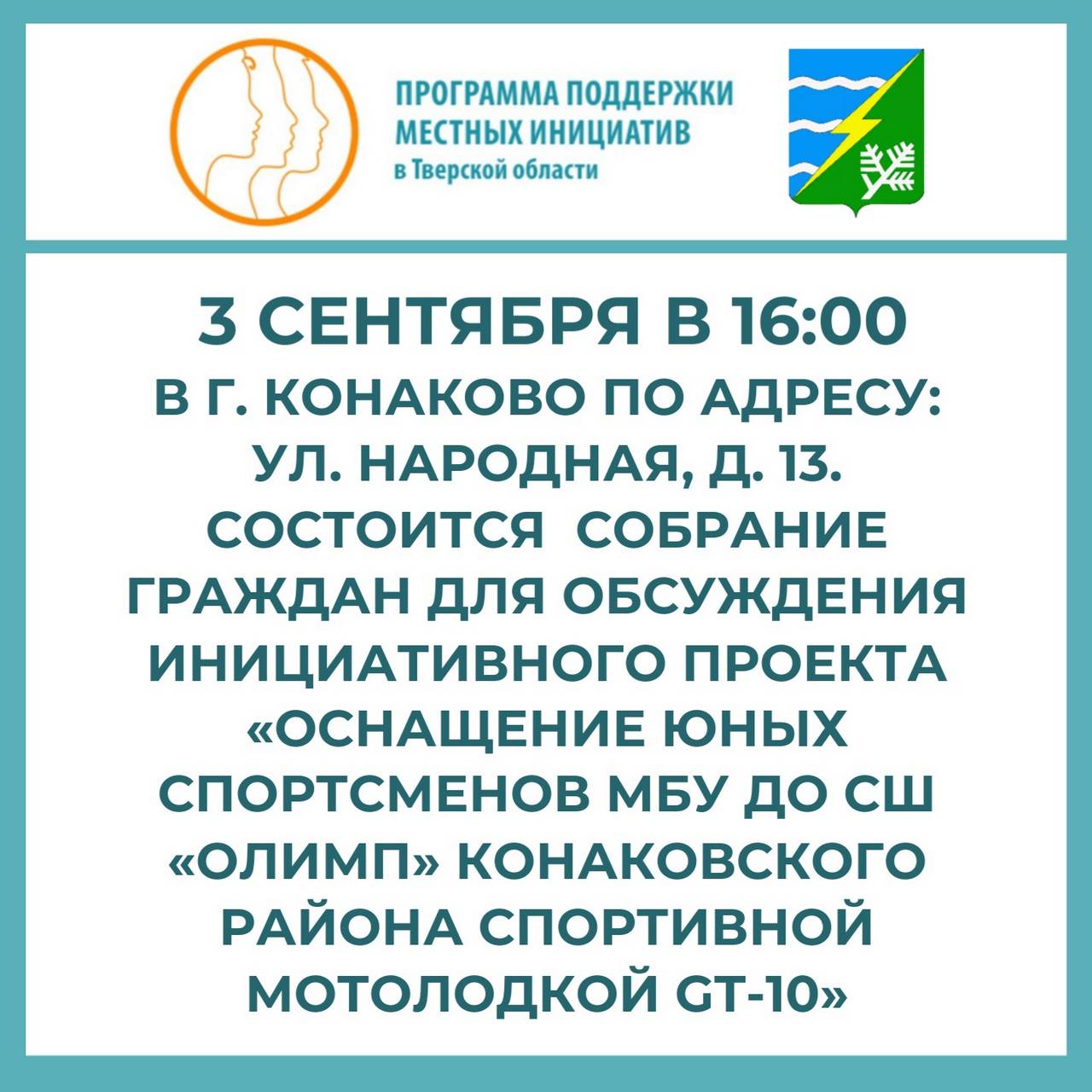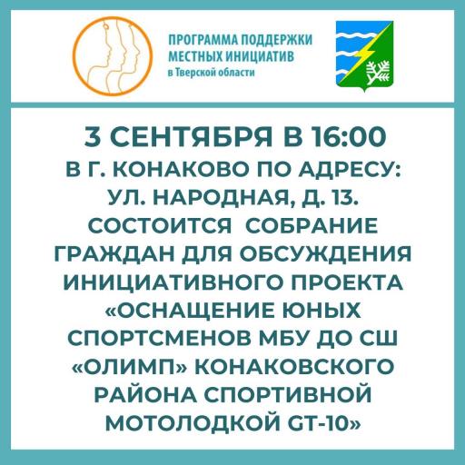 Инициативная группа, созданная для реализации инициативного проекта «Оснащение юных спортсменов МБУ ДО СШ «ОЛИМП» Конаковского района спортивной мотолодкой GT-10» приглашает вас на собрание граждан, которое состоится 3 сентября 2024 года в 16:00.